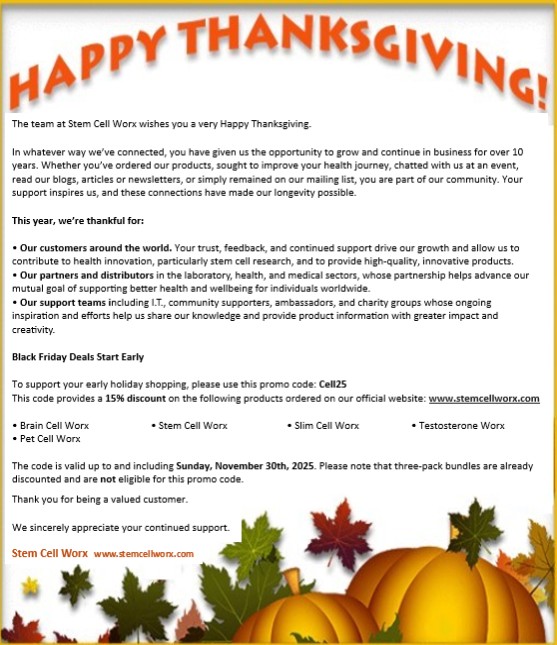 The team at Stem Cell Worx wishes you a very Happy Thanksgiving.